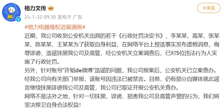 格力文传的微博账号周三(1月22日)发文称,近期格力电器收到公安机关出具的若干《行政处罚决定书》,有五名人士为了获取自身利益,在网络平台上捏造事实发布虚假消息,侮辱诽谤、造谣抹黑格力电器及高管,经公安机关立案调查后,已对他们违法行为人实施了行政处罚。