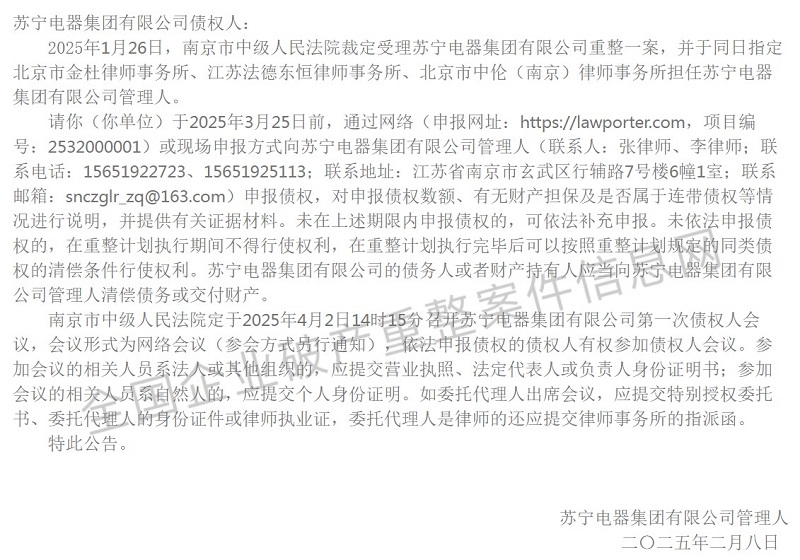 全国企业破产重整案件信息网公布的信息显示,苏宁控股集团有限公司、苏宁电器集团有限公司和苏宁置业集团有限公司分别被江苏天健华辰资产评估有限公司和苏州金螳螂建筑装饰股份有限公司申请重整。相关案件已被南京市中级人民法院受理。