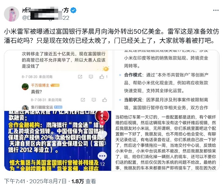 【鹿光网】近日,某社交媒体用户称“雷军通过富国银行茅XX向海外转出50亿美金”,小米集团官方周五(8月8日)作出明确回应:该传言为不实信息,公司已取证并启动司法程序,依法追究造谣传谣者责任。