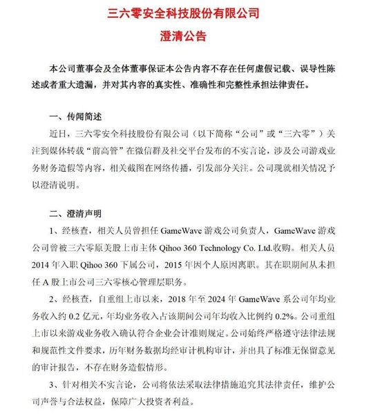 360集团当日发布严正声明,称玉红言论“完全背离事实”,公司始终合规经营,财务数据经权威机构审计并出具标准无保留意见。声明同时指出,重组上市以来游戏业务年均收入约0.2亿元,占比极低,收入确认符合会计准则,不存在造假情形。公司已启动法律程序追究玉红诽谤责任。周鸿祎个人转发该声明。
